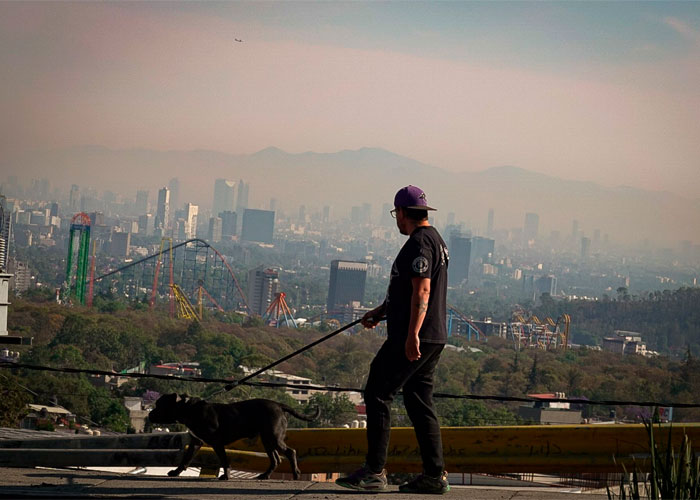 Una persona pasea a su mascota en la Ciudad de México durante una contingencia ambiental. Foto: Rogelio Morales, Cuartoscuro