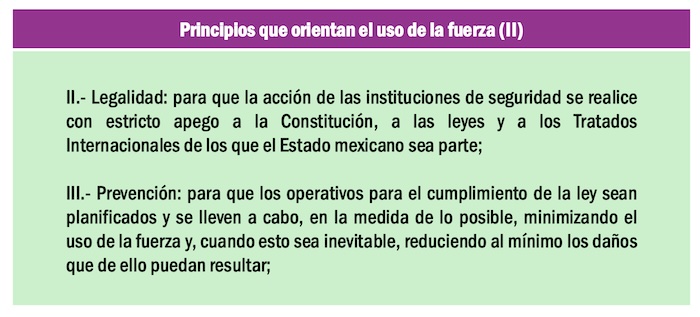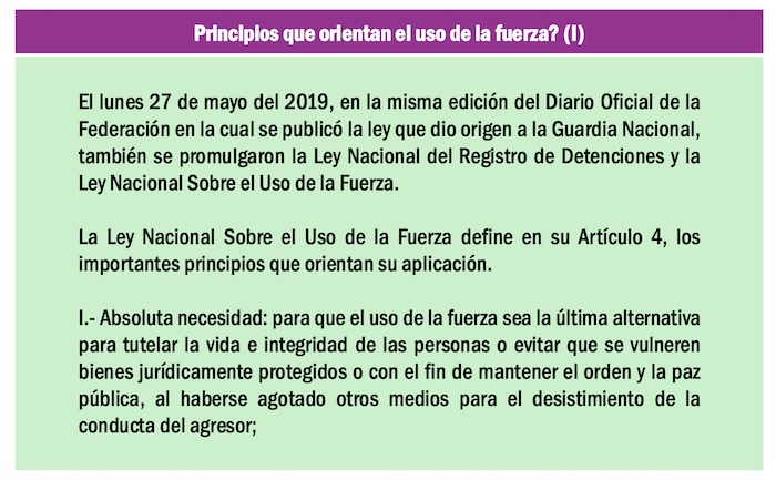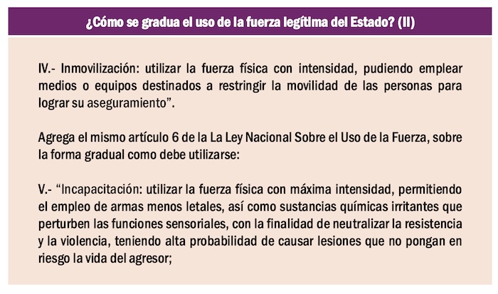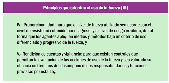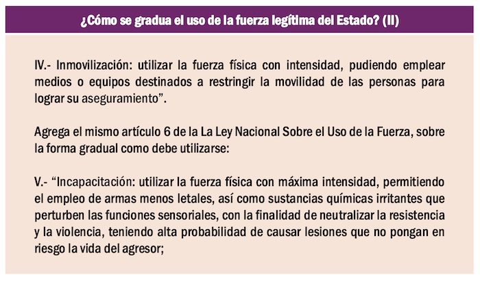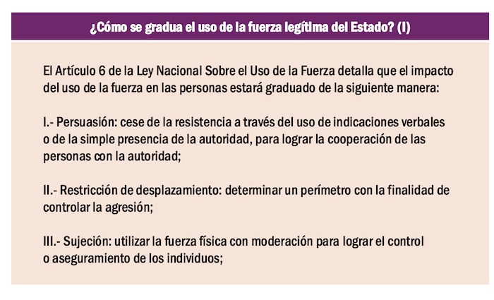 Además, en su Artículo 8 la Ley Nacional Sobre el Uso de la Fuerza advierte: “Los protocolos y procedimientos del uso de la fuerza deberán atender a la perspectiva de género, la protección de niñas, niños y adolescentes, así como la atención de situaciones de riesgo en el interior o en las inmediaciones de guarderías, escuelas, hospitales, templos, centros de reclusión y otros lugares en el que se congreguen personas ajenas a los agresores”.