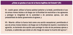 Los agentes legitimados para hacer uso de la fuerza, dice la Comisión Interamericana de Derechos Humanos, deben “aplicar un criterio de uso diferenciado y progresivo de la fuerza, determinando el grado de cooperación, resistencia o agresión de parte del sujeto al cual se pretende intervenir y con ello, emplear tácticas de negociación, control o uso de la fuerza, según corresponda, pues su despliegue de fuerza debe perseguir en todo momento reducir al mínimo los daños y lesiones que pudieran causarse a cualquier persona” (Pág. 533). http://www.oas.org/es/cidh/docs/anual/2015/doc-es/InformeAnual2015-cap4A-fuerza-ES.pdf