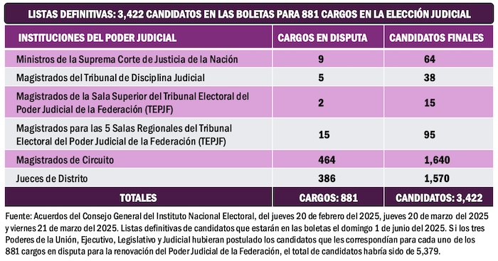 El pasado martes 22 de abril el Consejo General del INE informó que a 39 días de la Jornada Electoral de la elección del Poder Judicial de la Federación y, por primera vez, el Instituto Nacional Electoral (INE) lanzó una plataforma interactiva: “Conóceles, Practica y Ubica”, para que la ciudadanía pueda ensayar su voto, así como familiarizarse con las boletas, con lo que se busca reducir el tiempo de emisión del sufragio. En la plataforma los votantes podrán acceder a información relevante sobre las personas candidatas a juzgadoras, incluyendo su identidad, trayectoria y perfil curricular.
