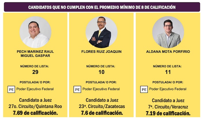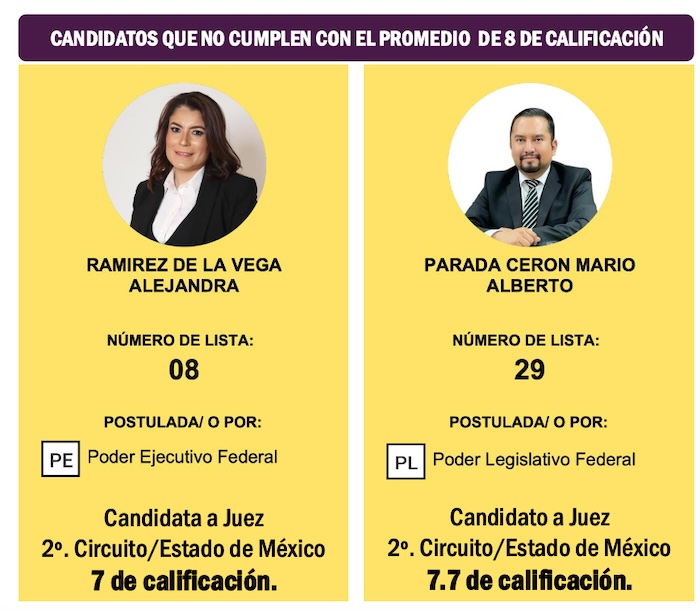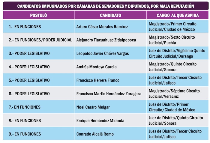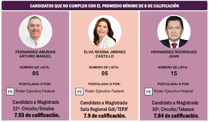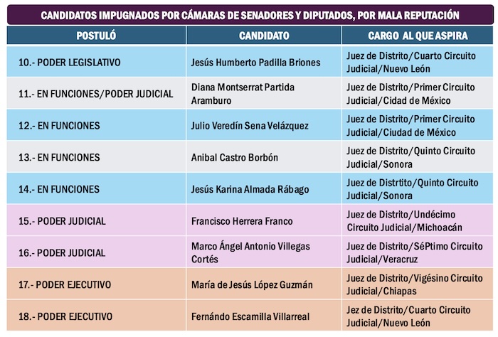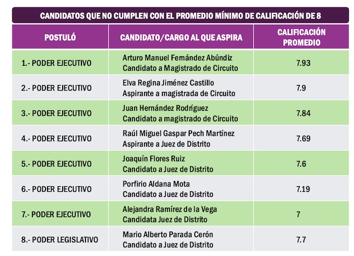 De los 18 candidatos que senadores y diputados señalan por faltas graves y de los cuales se pidió al INE que cancelara sus registros, dos fueron respaldados por el Poder Judicial y otros dos por el Poder Ejecutivo (Presidencia de la República). De los restantes ocho candidatos impugnados porque no cumplieron con el requisito de tener un mínimo de calificación promedio de 8, fueron siete los postulados por el Poder Ejecutivo y uno más por el Poder Legislativo. Aunque seis de ellos se quedaron a unas décimas de punto de llegar al 8 de promedio.