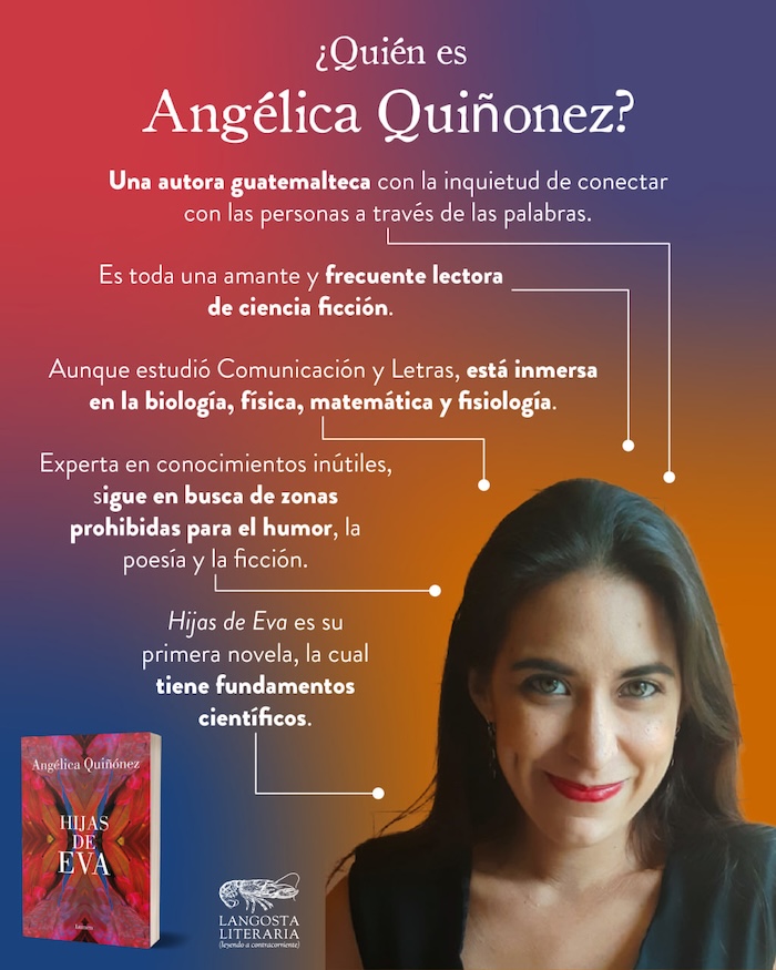 La historia la narra Angélica Quiñónez en Hijas de Eva, una novela construida con un mosaico de registros: desde notas periodísticas, bitácoras del proyecto científico, canciones, poemas y entrevistas de un mundo que perdió a las mujeres biológicas y trata de evitar la extinción de la especie mientras lidia con sus prejuicios y choca con la manera en la que entiende la feminidad.