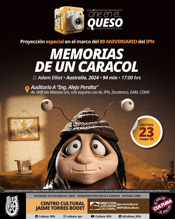 En el marco del 89 Aniversario del Instituto Politécnico Nacional (IPN), se proyectará de manera gratuita la película Memorias de un caracol en el Centro Cultural "Jaime Torres Bodet" el viernes 23 de mayo de 2025 a las 17:00 horas.