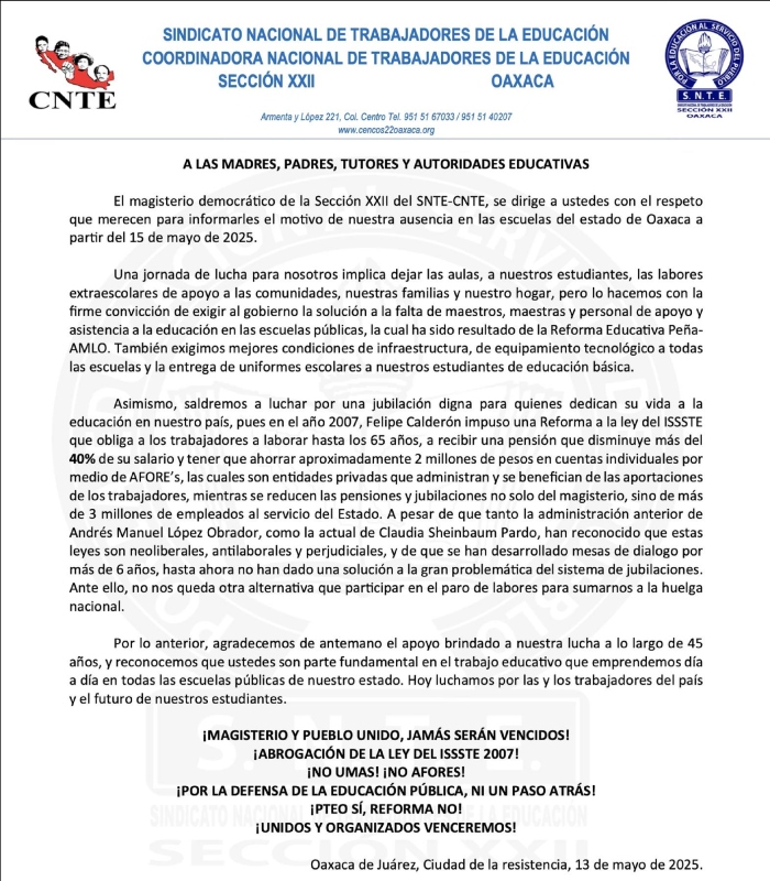 "Asimismo, saldremos a luchar por una jubilación digna para quienes dedican su vida a la educación en nuestro país, pues en el año 2007, Felipe Calderón impuso una Reforma a la ley del ISSSTE que obliga a los trabajadores a laborar hasta los 65 años, a recibir una pensión que disminuye más del 40 por ciento de su salario y tener que ahorrar aproximadamente dos millones de pesos en cuentas individuales por medio de AFORE, las cuales son entidades privadas que administran y se benefician de las aportaciones de los trabajadores, mientras se reducen las pensiones y jubilaciones no solo del magisterio, sino de más de tres millones de empleados al servicio del Estado", aseguró.