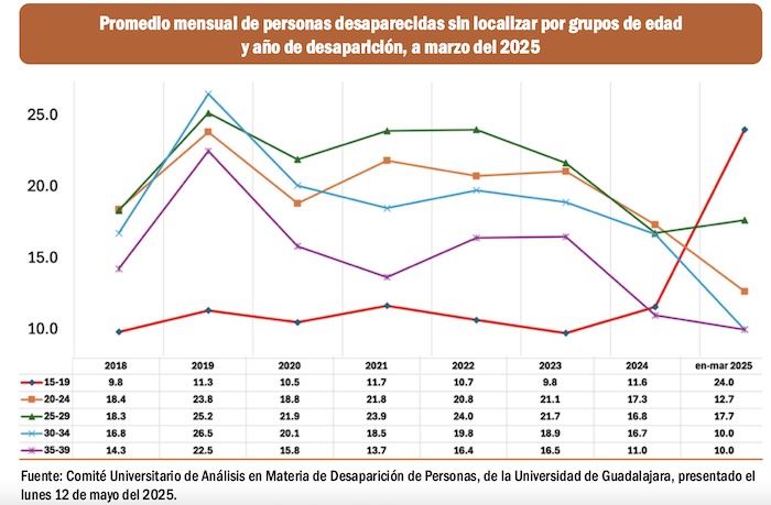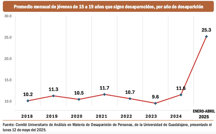 Podemos observar en el informe de la Universidad de Guadalajara que en el mismo periodo de enero-abril, de 2024 y 2025, el incremento de jóvenes desaparecidos de entre 15 y 19 años aumentó de 74 casos a 122 registros.