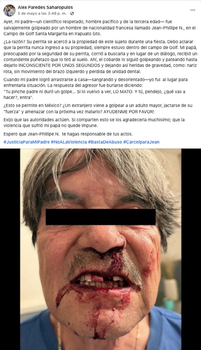 “Debo aclarar que la perrita nunca ingresó a su propiedad [de Jean-Philipe "N"], siempre estuvo dentro del campo de Golf”, relató el joven a través de una publicación en su perfil de Facebook, en la que exigió justicia para su padre y cuestionó si “¿esto se permite en México? ¿Un extranjero viene a golpear a un adulto mayor, jactarse de su "fuerza" y amenazar con la próxima vez matarlo?”.