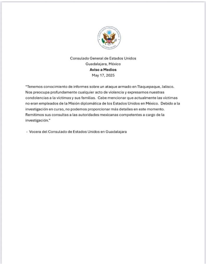 "Tenemos conocimiento de informes sobre un ataque armado en Tlaquepaque, Jalisco. Nos preocupa profundamente cualquier acto de violencia y expresamos nuestras condolencias a las víctimas y a sus familias", mencionó el Consulado en su mensaje firmado por su vocera Merlyn Schultz.