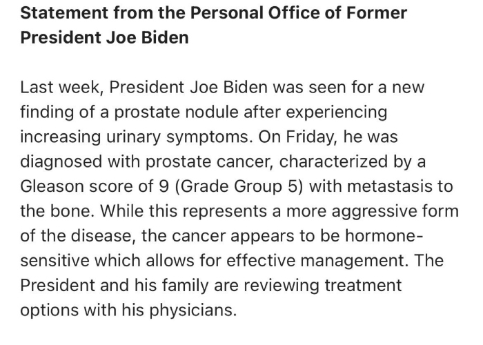 "Aunque representaba una forma más agresiva de la enfermedad, el cáncer parecía ser sensible a las hormonas, lo que permitía una gestión eficaz", resaltaba el texto. Biden y su familia "estaban estudiando las opciones de tratamiento con sus médicos".