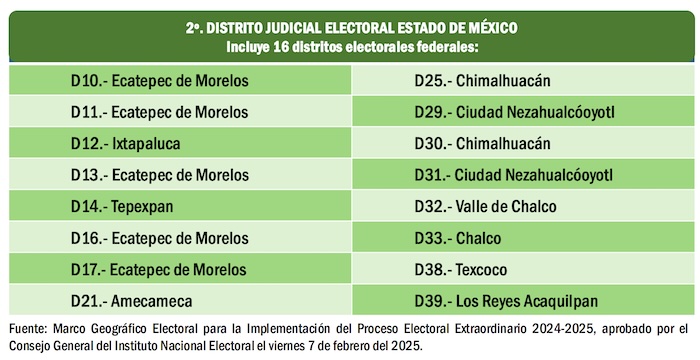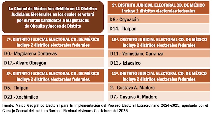 Cada una de las entidades del país corresponde a un Circuito Judicial. Y cada Circuito Judicial está dividido en diversas cantidades de Distritos Judiciales. El acuerdo del Consejo General del INE publicado en su portal oficial el pasado viernes 7 de febrero del 2025, señala que en el caso de los Circuitos Judiciales con 10 cargos o menos por elegir, se determinó que la votación correspondiente se llevará a cabo en un sólo territorio, es decir, en un sólo Distrito Judicial que abarca toda la entidad.
