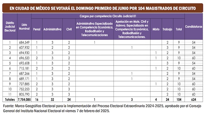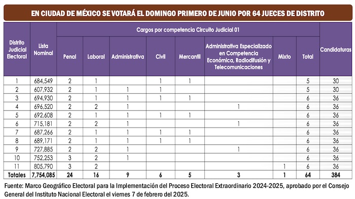 De esta manera, en cada uno de esos 11 Distritos Judiciales Electorales, los ciudadanos solo votarán por un mínimo de nueve y un máximo de diez Magistrados de Circuito. Y en el caso de los Jueces, los ciudadanos de cada Distrito Judicial Electoral únicamente tendrán que votar por un mínimo de cinco y un máximo de seis Jueces de Distrito.