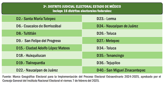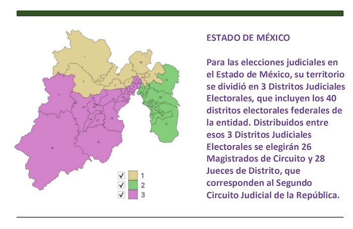Esto facilitará la elección en el Estado de México pues los ciudadanos sólo tendrán que elegir entre ocho y nueve Magistrados de Circuito, por cada uno de los Distritos Judiciales Electorales y un máximo de diez jueces de Distrito por cada unidad territorial de las tres en las que se dividió el estado.