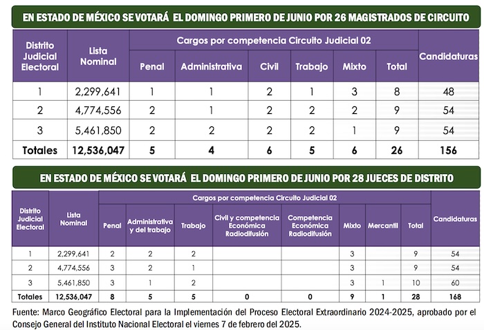 De tal forma que en lugar de revisar el total de 156 candidatos a Magistrados de Circuito, los ciudadanos mexiquenses sólo tendrán que revisar entre 48 y 54 candidatos en cada boleta; mientras que para Jueces de Distrito el máximo de aspirantes que aparecerán en las boletas oscilarán entre 54 y 60, en lugar de los 168 candidatos totales de toda la entidad.
