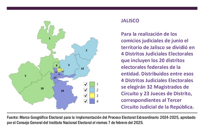 En Jalisco está programada la elección de 32 Magistrado de Circuito y 23 Jueces de Distrito. Por esa razón el territorio jalisciense, correspondiente al Tercer Circuito Judicial de la República, que incluye 20 distritos electorales federales, fue compactado en 4 grandes Distritos Judiciales Electorales: uno para zona metropolitana de Guadalajara y otros tres para los restantes municipios de la entidad.