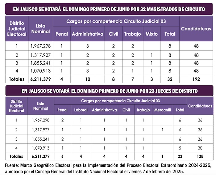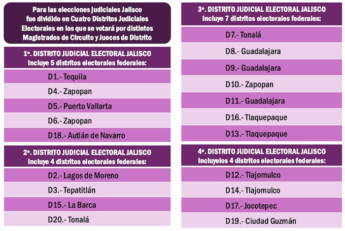 Los habitantes de Jalisco podrán votar por un máximo de ocho Magistrados de Circuito en cada uno de los cuatro Distritos Judiciales Electorales. En el caso de los Jueces de Distrito tendrán que elegir a un máximo de seis nuevos funcionarios judiciales por cada demarcación territorial, respectivamente.