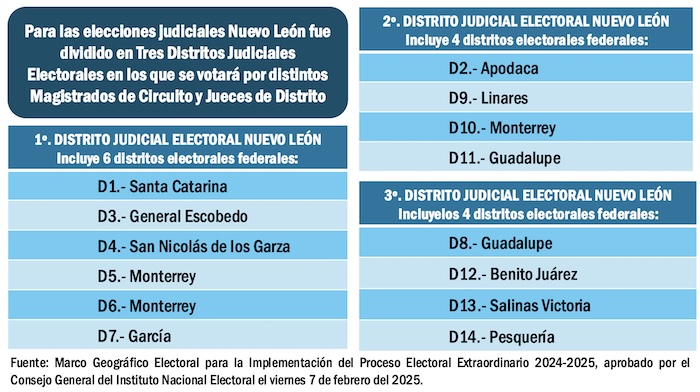 En el caso de Nuevo León, donde hay 14 distritos electorales federales, el territorio fue compactado por el Instituto Nacional Electoral en tres Distrito Judiciales Electorales, para facilitar la elección de 23 Magistrados de Circuito y 15 Jueces de Distrito, que se distribuirán entre estas tres grandes demarcaciones.