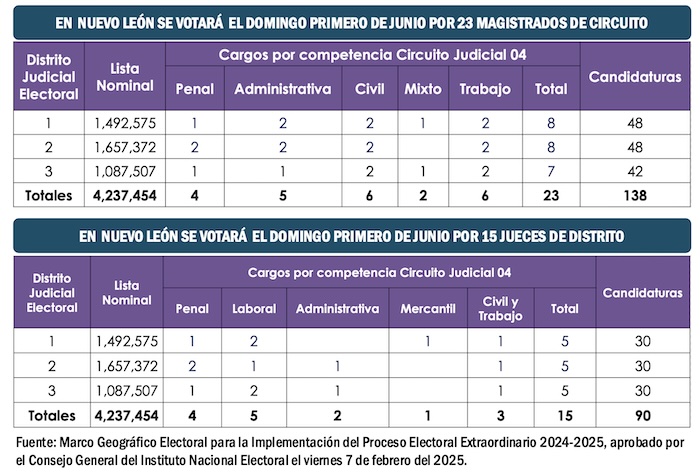 Por lo tanto, los habitantes de Nuevo León tendrán que votar por un máximo de 8 Magistrados de Circuito en cada Distrito Judicial Electoral de la entidad y por un máximo de cinco Jueces de Distrito en cada demarcación territorial. De esta manera no tendrán que preocuparse por revisar el total de 138 candidatos a Magistrados y de 90 aspirantes a Jueces en todo Nuevo León.