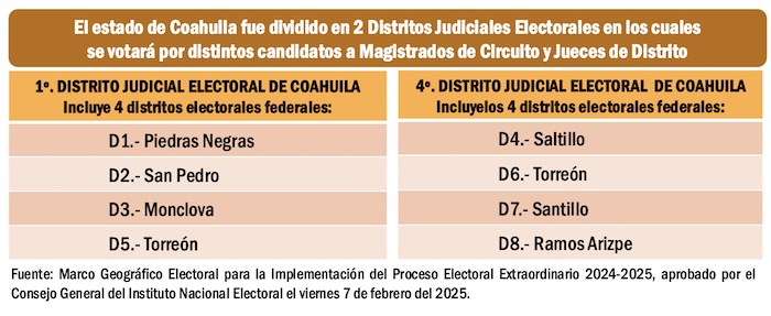 En el Distrito Judicial Electoral número uno de Coahuila se elegirán 10 nuevos Magistrados de Circuito y habrá en la boleta 60 nombres para escoger. Mientras que en el Segundo Distrito Judicial Electoral coahuilense se elegirá a 9 Magistrados de Circuito de una lista de 54 aspirantes. En el caso de los nuevos Jueces de Distrito, en el Primer Distrito Judicial Electoral de Coahuila se votará 6 nuevos Jueces de Distrito y la boleta incluirá 36 candidatos; mientras que en la boleta del Segundo Distrito Judicial Electoral coahuilense también se elegirán 6 nuevos Jueces de Distrito y también se podrá elegir de entre 36 aspirantes.