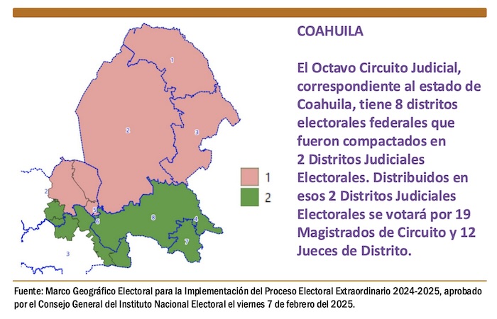 El Octavo Circuito Judicial, correspondiente al estado de Coahuila, tiene 8 distritos electorales federales que fueron compactados en 2 Distritos Judiciales Electorales. Distribuidos en esos 2 Distritos Judiciales Electorales se votará por 19 Magistrados de Circuito y 12 Jueces de Distrito.