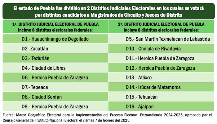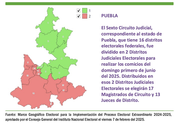 El Sexto Circuito Judicial, correspondiente al estado de Puebla, que tiene 16 distritos electorales federales, fue dividido en 2 Distritos Judiciales Electorales para realizar los comicios del domingo primero de junio del 2025. Distribuidos en esos dos Distritos Judiciales Electorales se elegirán 17 Magistrados de Circuito y 13 Jueces de Distrito.
