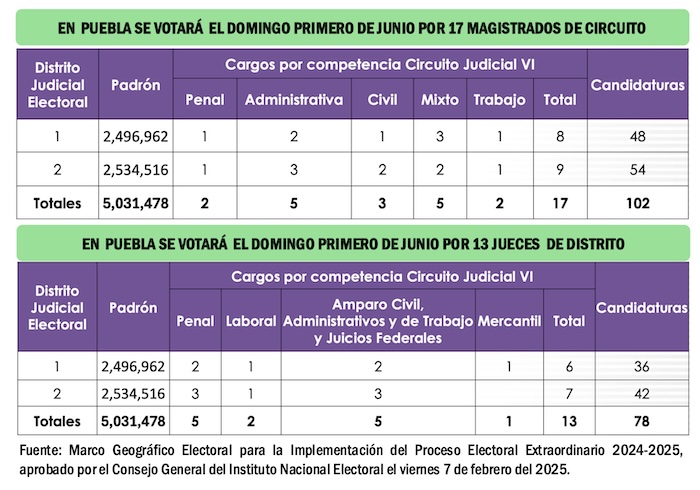 De tal forma que en el Primer Distrito Judicial Electoral de Puebla los ciudadanos votarán por 8 nuevos Magistrados de Circuito y habrá 48 nombres de aspirantes en la boleta. En el Distrito Judicial Electoral número dos de Puebla los ciudadanos votarán por para elegir nueve Magistrados de Circuito y en la boleta habrá 54 nombres, entre mujeres y varones. Mientras tanto, en el primer Circuito Judicial Electoral de Puebla se sufragará para elegir seis Jueces de Distrito y en la boleta sólo habrá 36 hombres; mientras que en el Distrito Judicial dos de Puebla los ciudadanos sufragarán por siete nuevos Jueces de Distrito y en la boleta sólo habrá 42 nombres, entre mujeres y hombres.