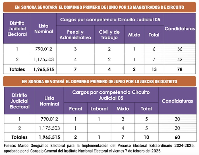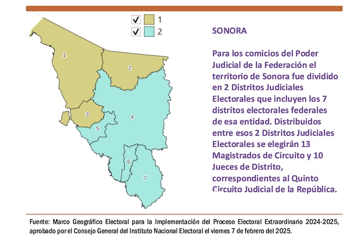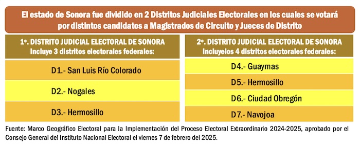 Como podemos observar en el caso de Sonora, en el primer Distrito Judicial Electoral se votará por seis nuevos Magistrados de Circuito y el total de candidatos que aparecerán en las boletas serán 36; mientras que, en el Segundo Distrito Judicial Electoral de Sonora, se sufragará por siete nuevos Magistrados de Circuito y el total de candidatos en la boleta serán 42. En el caso de los Jueces de Distrito, se elegirán cinco por cada uno de los dos Distritos Judiciales Electorales y sólo habrá 30 candidatos en cada una de las boletas electorales.