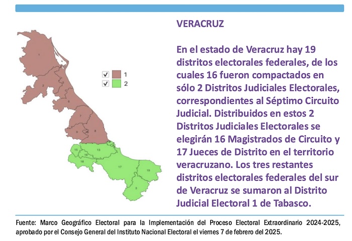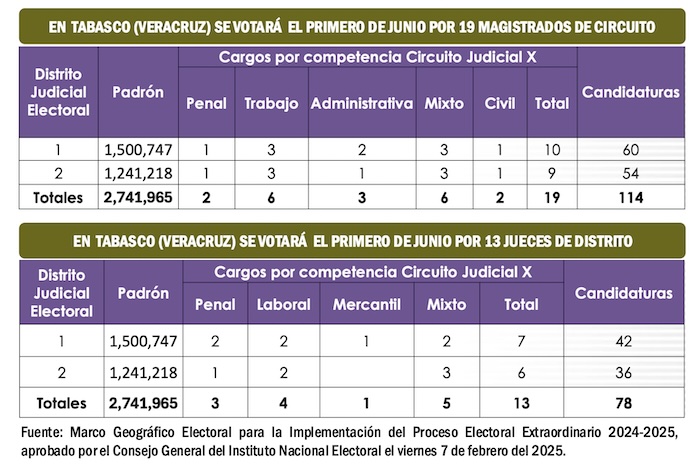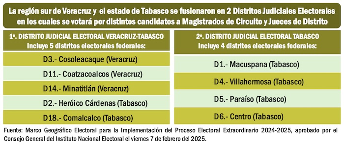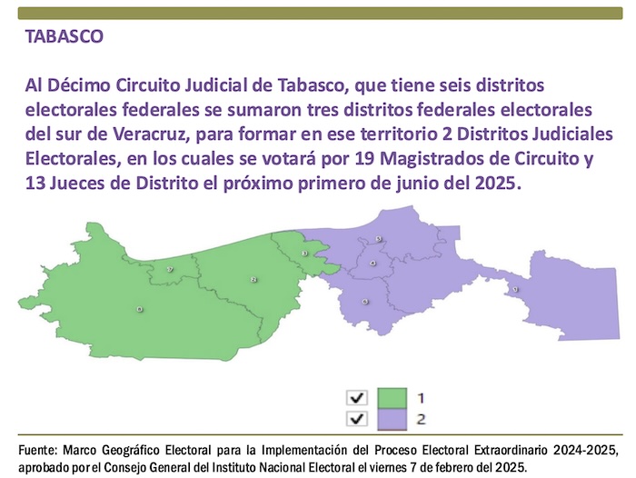 Al Décimo Circuito Judicial de Tabasco, que tiene seis distritos electorales federales se sumaron tres distritos federales electorales del sur de Veracruz, para formar en ese territorio dos Distritos Judiciales Electorales, en los cuales se votará por 19 Magistrados de Circuito y 13 Jueces de Distrito el próximo primero de junio del 2025.