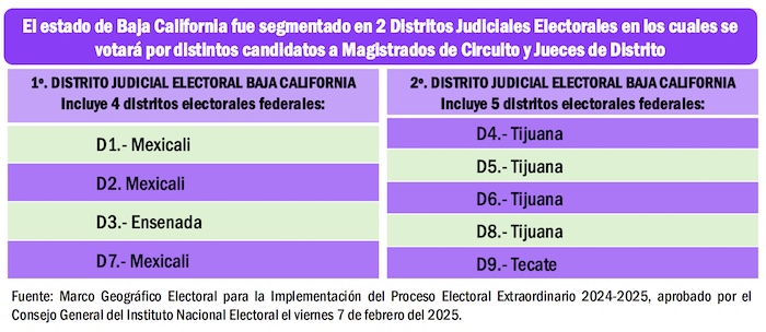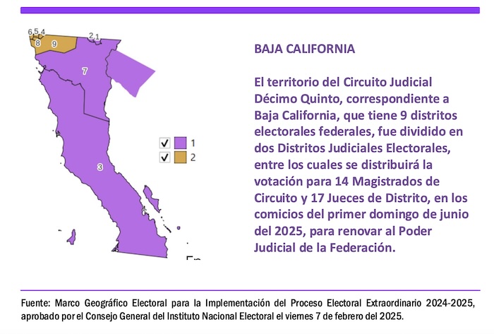 El territorio del Circuito Judicial Décimo Quinto, correspondiente a Baja California, que tiene 9 distritos electorales federales, fue dividido en dos Distritos Judiciales Electorales, entre los cuales se distribuirá la votación para 14 Magistrados de Circuito y 17 Jueces de Distrito, en los comicios del primer domingo de junio del 2025, para renovar al Poder Judicial de la Federación.