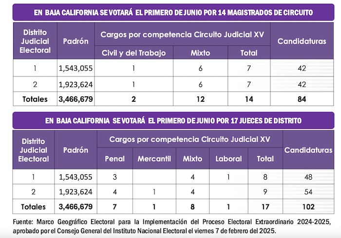 En el Distrito Judicial Electoral número 1 de Baja California los ciudadanos votarán por siete nuevos Magistrados de Circuito y en la boleta encontrarán un máximo de 42 candidatos; en el Distrito Judicial Electoral número 2 de Baja California se votará por la misma cantidad de Magistrados de Circuito y el número de candidatos en la boleta será similar. Por lo que corresponde a la elección de Jueces de Distrito, en el primer Distrito Judicial Electoral de Baja California se votará por 8 nuevos funcionarios y habrá un máximo de 48 candidatos en la boleta; mientras que en el segundo Distrito Judicial Electora bajacaliforniano se votará por 9 nuevos Jueces de Distrito y en la boleta aparecerán los nombres de un máximo de 54 candidatos entre mujeres y hombres.