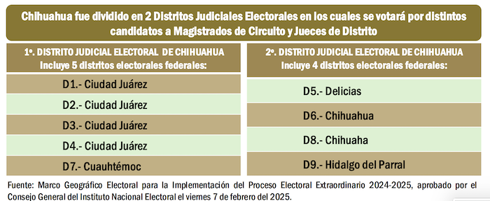 En cada uno de los dos Distritos Judiciales Electorales de Chihuahua se elegirán 6 nuevos Magistrados de Circuito, respetivamente, y en cada una de las boletas habrá un máximo de 36 candidatos. Mientras que en el primer Distrito Judicial Electoral chihuahuense se votará por 7 Jueces de Distrito y aparecerán en la boleta un máximo de 42 candidatos, en tanto que en el segundo Distrito Judicial Electoral de Chihuahua se sufragará por 6 Jueces de Distrito y el ciudadano podrá elegir entre un máximo de 36 candidatos.