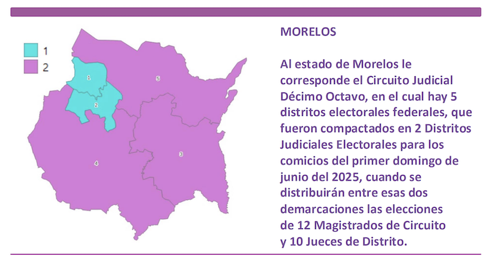 Al estado de Morelos le corresponde el Circuito Judicial Décimo Octavo, en el cual hay 5 distritos electorales federales, que fueron compactados en 2 Distritos Judiciales Electorales para los comicios del primer domingo de junio del 2025, cuando se distribuirán entre esas dos demarcaciones las elecciones de 12 Magistrado de Circuito y 10 Jueces de Distrito.