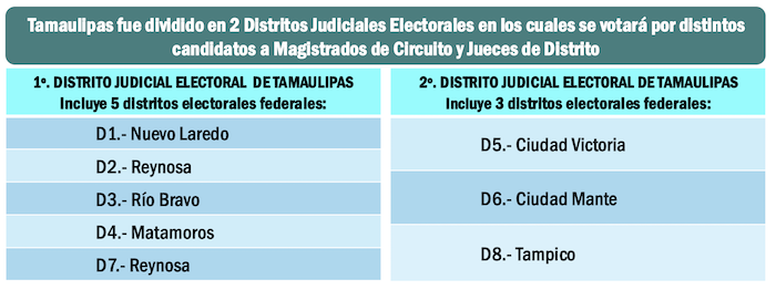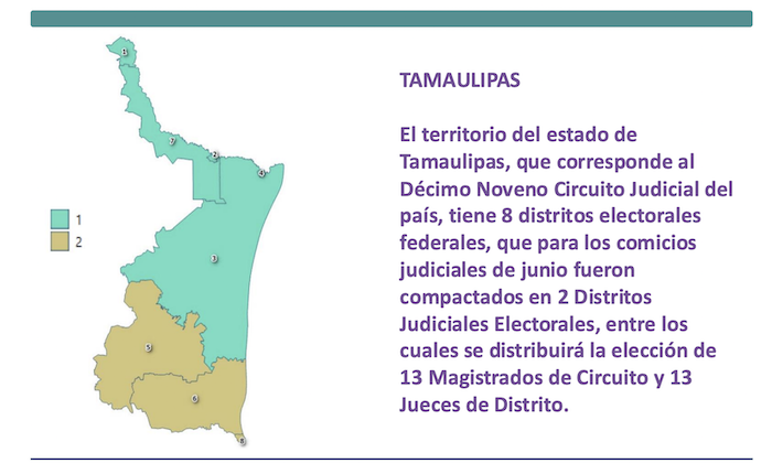 El territorio del estado de Tamaulipas, que corresponde al Décimo Noveno Circuito Judicial del país, tiene 8 distritos electorales federales, que para los comicios judiciales de junio fueron compactados en 2 Distritos Judiciales Electorales, entre los cuales se distribuirá la elección de 13 Magistrados de Circuito y 13 Jueces de Distrito.