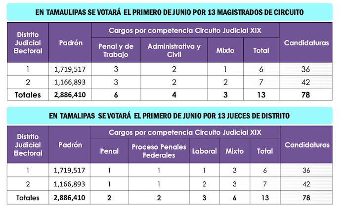 En el primer Distrito Judicial Electoral de Tamaulipas se elegirán 6 nuevos Magistrados de Circuito y 6 nuevos Jueces de Distrito, por lo que en sus respectivas boletas aparecerán un máximo de 36 candidatos, entre mujeres y hombres. Mientras que en el segundo Distrito Judicial Electoral tamaulipeco se votará por 7 Magistrados de Circuito y 7 Jueces de Distrito, respectivamente, y en cada una de las correspondientes boletas aparecerán los nombres de 42 candidatos.