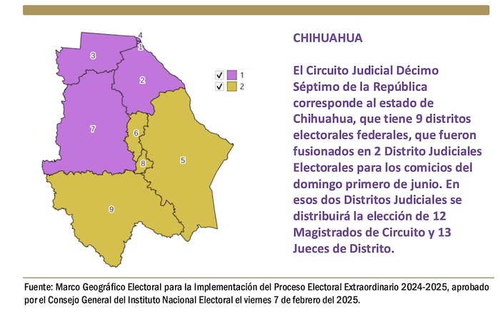 El Circuito Judicial Décimo Séptimo de la República corresponde al estado de Chihuahua, que tiene 9 distritos electorales federales, que fueron fusionados en 2 Distrito Judiciales Electorales para los comicios del domingo primero de junio. En esos dos Distritos Judiciales se distribuirá la elección de 12 Magistrados de Circuito y 13 Jueces de Distrito.