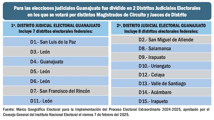 El Circuito Judicial Décimo Sexto de la República, correspondiente a Guanajuato, tiene 15 distritos electorales federales, pero fue dividido, para los comicios judiciales, en 2 Distritos Judiciales Electorales, en los cuales se distribuirá la votación para elegir 13 Magistrados de Circuito y 14 Jueces de Distrito.