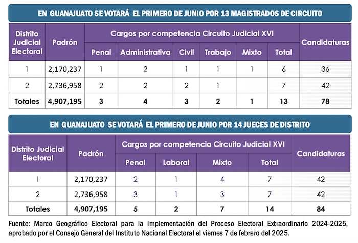 En el primer Distrito Judicial Electoral de Guanajuato se votará por 6 Magistrados de Circuito y aparecerán en la boleta 36 candidatos; en el segundo Distrito Judicial Electoral guanajuatense se votará por 7 nuevos Magistrados de Circuito y en la boleta habrá 42 nombres, entre mujeres y varones. Por lo que corresponde a la elección de Jueces de Distrito, en cada uno de los dos Distritos Judiciales Electorales de Guanajuato se elegirán 7 nuevos funcionarios judiciales y en cada una de las boletas habrá un máximo de 42 candidatos.