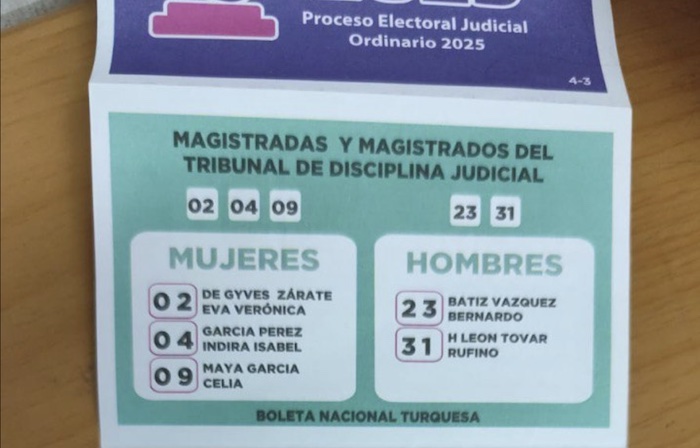 En el mismo acordeón donde se pide votar por la abogada cercana al Alcalde panista Mauricio Tabe, en la boleta verde y en la boleta azul se plantea sufragar por un funcionario del Gobierno de Clara Brugada y por un excolaborador del Ministro en retiro Arturo Zaldívar, quien participó en el Comité de Evaluación del Poder Ejecutivo para determinar la idoneidad de los candidatos.
