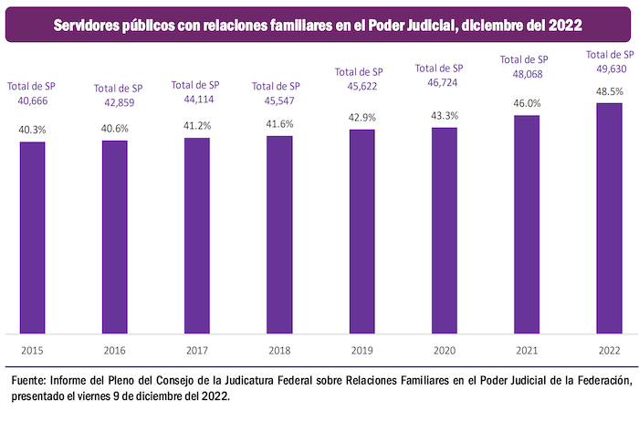 En 2021, la cifra del nepotismo ascendía al 82.6 por ciento, es decir, 723 de los juzgados o tribunales de todo el Poder Judicial reportaron que entre su personal había servidoras y servidores públicos que tenían alguna relación familiar con otra persona que también trabajaban en áreas bajo la responsabilidad del Consejo de la Judicatura Federal.