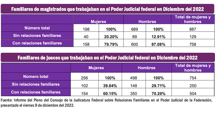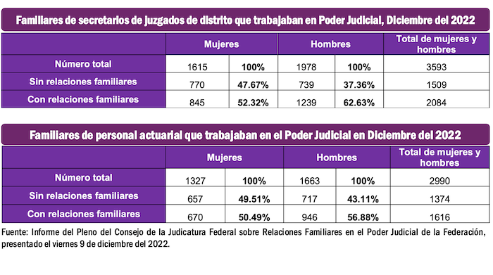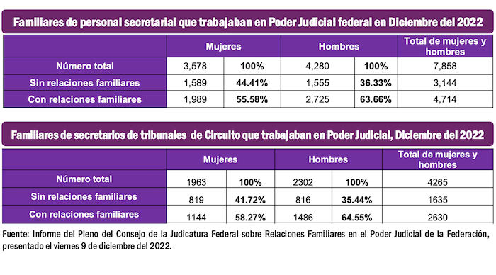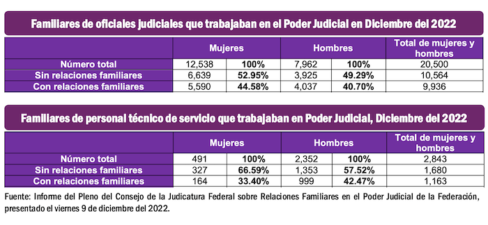 El estudio sobre el nepotismo en el Poder Judicial de la federación, presentado en el Consejo de la Judicatura Federal el viernes 9 de diciembre de 2022, establece además que el 67 por ciento, es decir, 616 de los órganos jurisdiccionales, tribunales o juzgados, que integran el Poder Judicial de la Federación, reportó que entre su personal había servidoras y servidores públicos que tenían alguna relación familiar con otra persona que también trabajaban en áreas bajo la responsabilidad del Consejo de la Judicatura Federal.