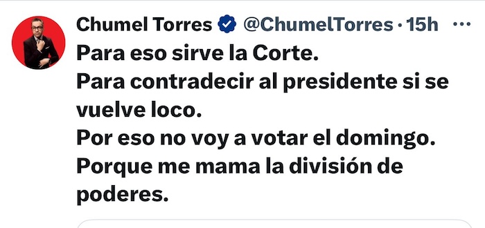 “No votarás la prostitución de la democracia. No votarás la corrupción del voto. No votarás el fin de la justicia. No votarás la muerte de la República”, escribió, por ejemplo, Krauze, director de la revista Letra Libres en su cuenta de X. Hace unos meses, de cara al proceso electoral de 2024, el propio Krauze pedía a los más jóvenes a salir a las urnas y decidir con conciencia.