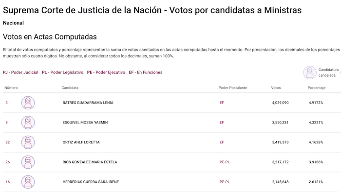 La tercera y la cuarta candidatas más votadas son Yasmín Esquivel (3 millones 550 mil 231 sufragios) y Loretta Ortiz (3 millones 419 mil 373 votos), quienes en su paso por la Corte defendieron de Norma Piña, primero el llamado Plan C impulsado por el expresidente Andrés Manuel López Obrador y, después, la celebración de la elección judicial.