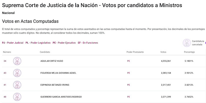 Hugo Aguilar Ortiz es de momento el candidato a ministro que más votos acumula. Los Cómputos Distritales Judiciales del Instituto Nacional Electoral (INE) le dan 4 millones 255 mil 61 votos, con lo cual, de acuerdo a lo establecido en la Ley, le permitirá presidir la Suprema Corte 167 después de que Benito Juárez presidiera el máximo tribunal de justicia del país.