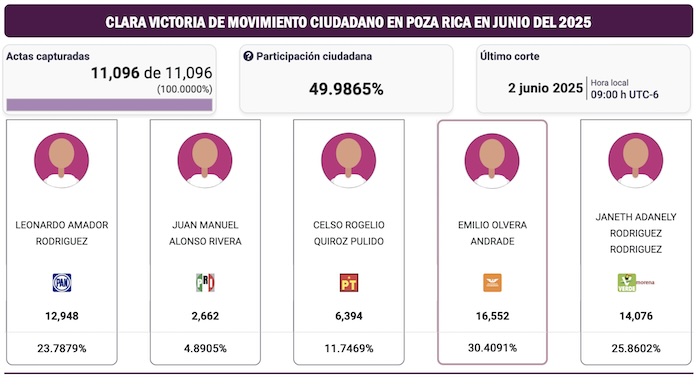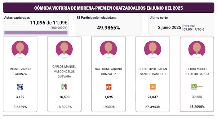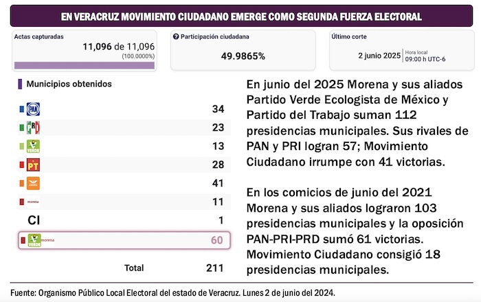 En junio del 2025 Morena y sus aliados Partido Verde Ecologista de México y Partido del Trabajo suman 112 presidencias municipales. Sus rivales de PAN y PRI logran 57; Movimiento Ciudadano irrumpe con 41 victorias. En los comicios de junio del 2021 Morena y sus aliados lograron 103 presidencias municipales y la oposición PAN-PRI-PRD sumó 61 victorias. Movimiento Ciudadano consigió 18 presidencias municipales.