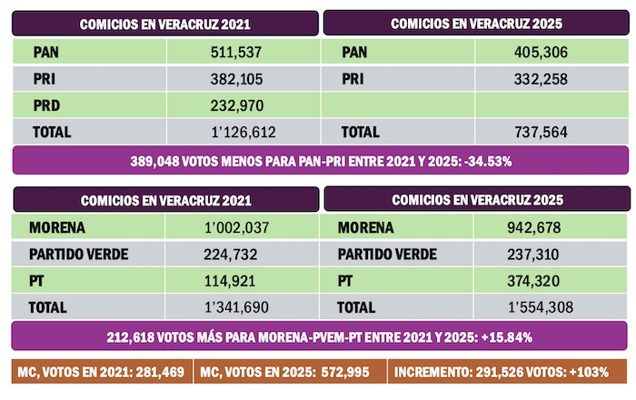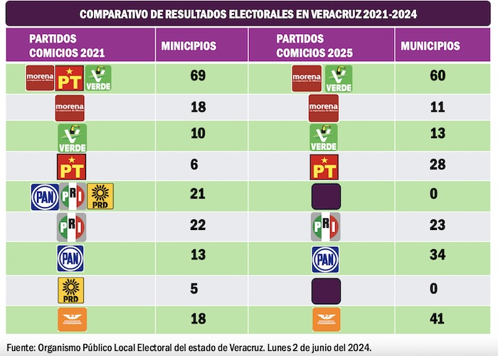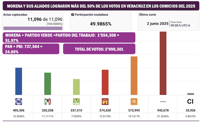 Ciudad de México, 4 de junio (SinEmbargo).- Morena y sus aliados tuvieron un desempeño destacado en los comicios del pasado domingo primero de junio del 2025 en el estado de Veracruz, pues además de ganar ocho de los 10 municipios más poblados, aumentaron su porcentaje de votación con respecto a los comicios municipales del 2021, mientras que los sufragios captados en las urnas por PAN y PRI tuvieron una sensible caída del 34 por ciento. Además, Morena, Partido Verde Ecologista de México y Partido del Trabajo aumentaron de 103 a 112 sus triunfos por las alcaldías veracruzanas.