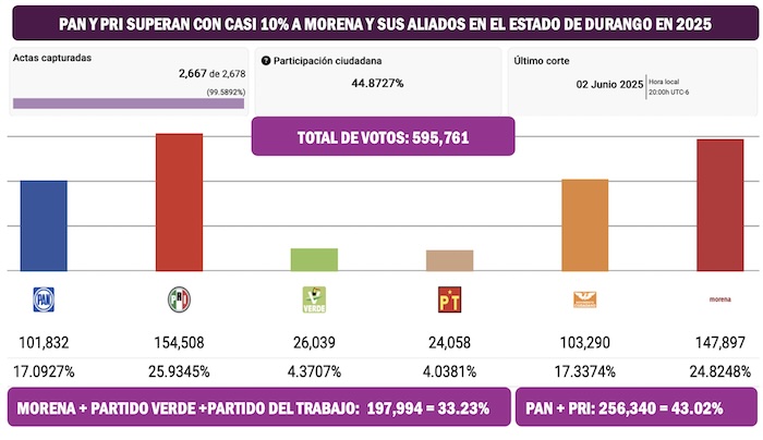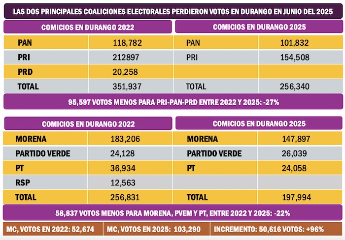 En Durango las dos fuerzas principales perdieron votos en los comicios del 2025, con respecto a sus resultados en la contienda municipal del 2022. Sin embargo, el retroceso electoral más marcado es el de Morena, pues después de los comicios del año pasado, cuando ganó en territorio de Durango la contienda por la Presidencia de la República, los dos senadores de Mayoría Relativa y tres de las cuatro diputaciones federales, se esperaba un mejor desempeñó en los comicios del pasado primero de junio.
