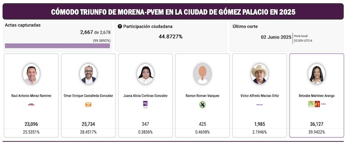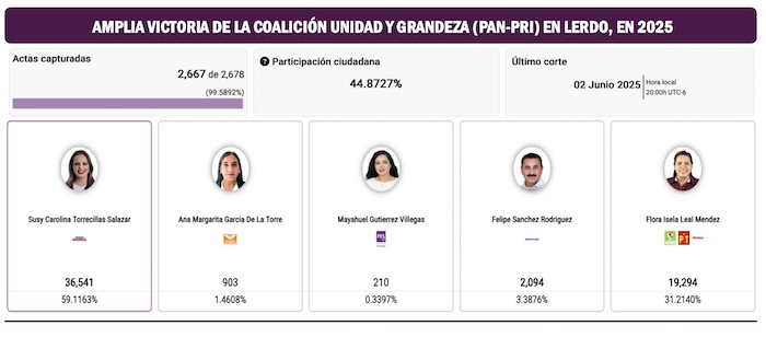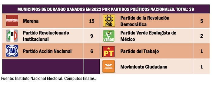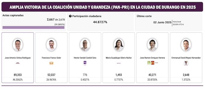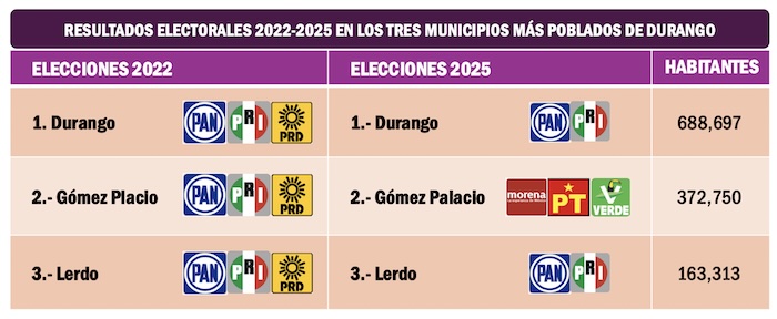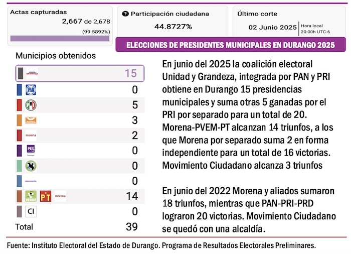 En junio del 2025 la coalición electoral Unidad y Grandeza, integrada por PAN y PRI se perfila para ganar en Durango 15 presidencias municipales y sumar otras 5 ganadas por el PRI por separado, para un total de 20. Morena-PVEM-PT alcanzarían 14 triunfos, a los que Morena por separado sumaría 2, para un total de 16 victorias. Movimiento Ciudadano alcanzó 3 triunfos. En junio del 2022 Morena y aliados sumaron 18 triunfos, mientras que PAN-PRI-PRD lograron 20 victorias. Movimiento Ciudadano se quedó con una alcaldía.