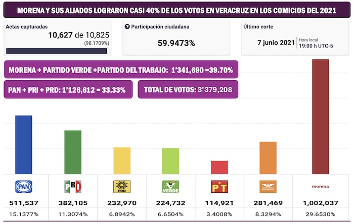 En los comicios municipales del 2021 en Veracruz, Morena y sus aliados PVEM y PT sumaron casi el 40 por ciento de los votos depositados en las urnas; y en las elecciones del pasado domingo primero de junio rebasaron el 50 por ciento de la votación estatal.