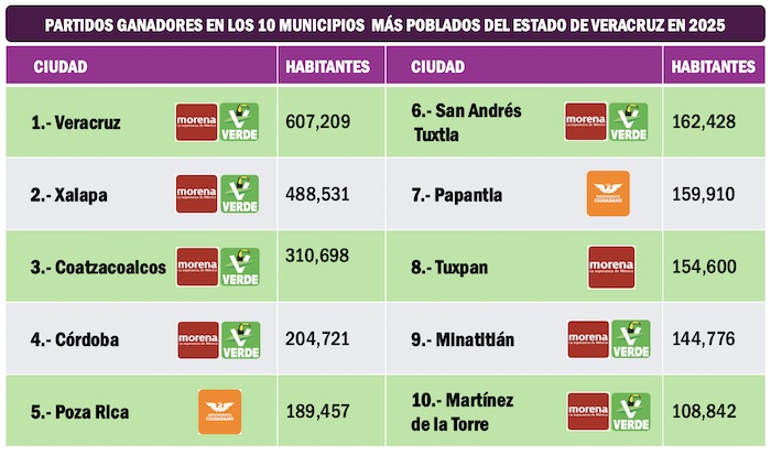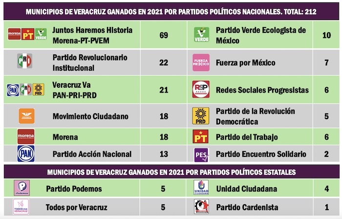 Morena sumó a su cuenta los dos municipios más grandes de Veracruz: el puerto jarocho y la capital, Xalapa. Un desempeñó relevante fue el del partido Movimiento Ciudadano, que habría incrementado de 18 a 41 sus triunfos en la disputa de las presidencias municipales en Veracruz, donde también creció su fuerza electoral un 103 por ciento.
