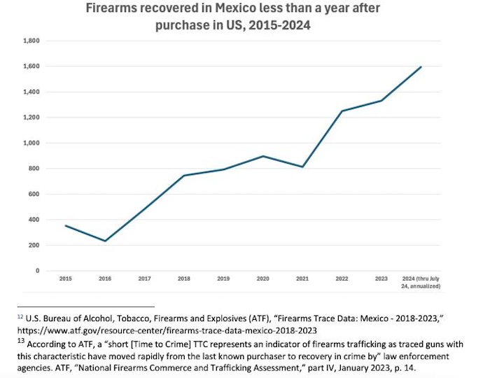 En diciembre de 2024, expuso Stop US Arms to Mexico , la ATF publicó datos sobre los intervalos del “tiempo transcurrido hasta el delito" para las armas recuperadas en México desde 2015 hasta julio de 2024. De 70 mil 614 armas de fuego recuperadas en México en la última década y rastreadas hasta una compra en Estados Unidos, 7,789 fueron recuperadas menos de un año después de su compra original.