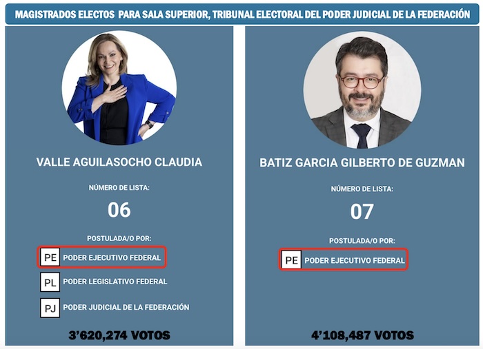 Los dos aspirantes que son virtuales candidatos electos para asumir sus cargos como ministros de la Sala Superior del Poder Judicial de la Federación también llegaron a la boleta con el respaldo del Poder Ejecutivo depositado en Claudia Sheinbaum.