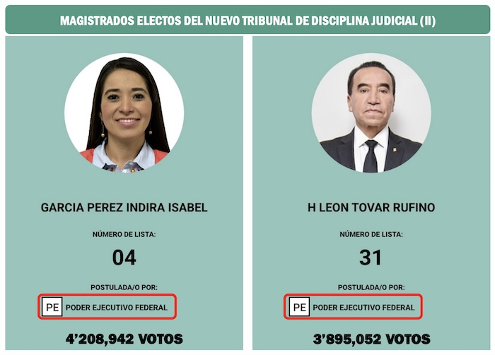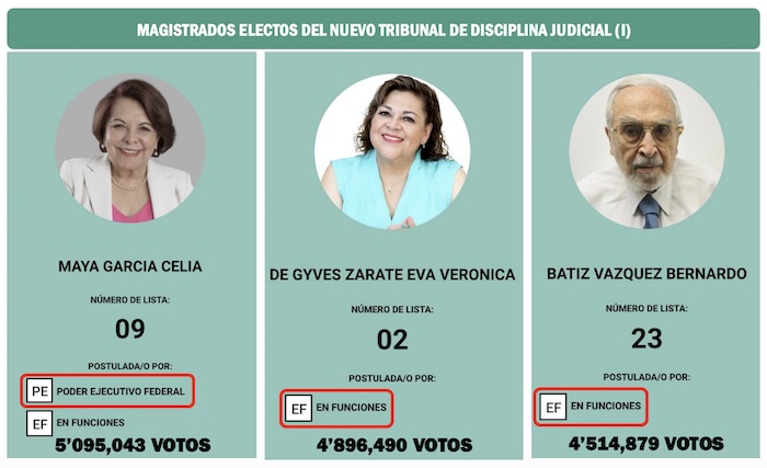 También tres de los cinco nuevos magistrados que integrarán el Tribunal de Disciplina Judicial, una nueva institución clave en el reformado Poder Judicial de la Federación llegaron a la boleta con el respaldo del Poder Ejecutivo. Y los otros dos tienen vinculaciones con administraciones de izquierda vinculadas a Morena y al proyecto de la Cuarta Transformación.